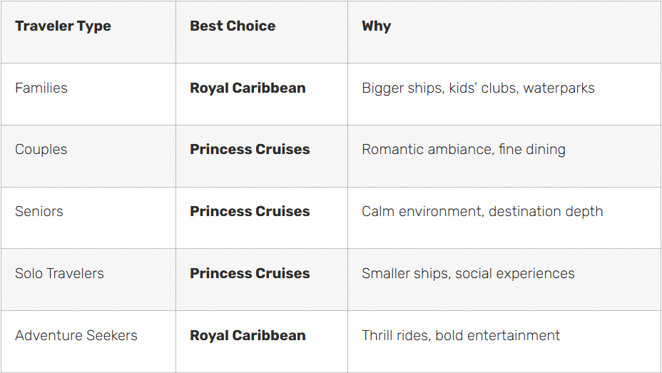 - Princess Cruises suits couples, retirees, and culture enthusiasts who value relaxation, fine dining, and enriching experiences.